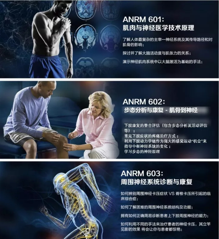 ANRM601 ( 掌握中枢神经康复原则) - > 603 (了解周围神经与辩证不同种类疾病) - > 602 (第三天中枢神经系统与眼球部分 – 了解脑-脑干-眼球的重要整合) - > 604 (学习神经系统查体与评估)  -> 之后选择 相对应有兴趣模块学习